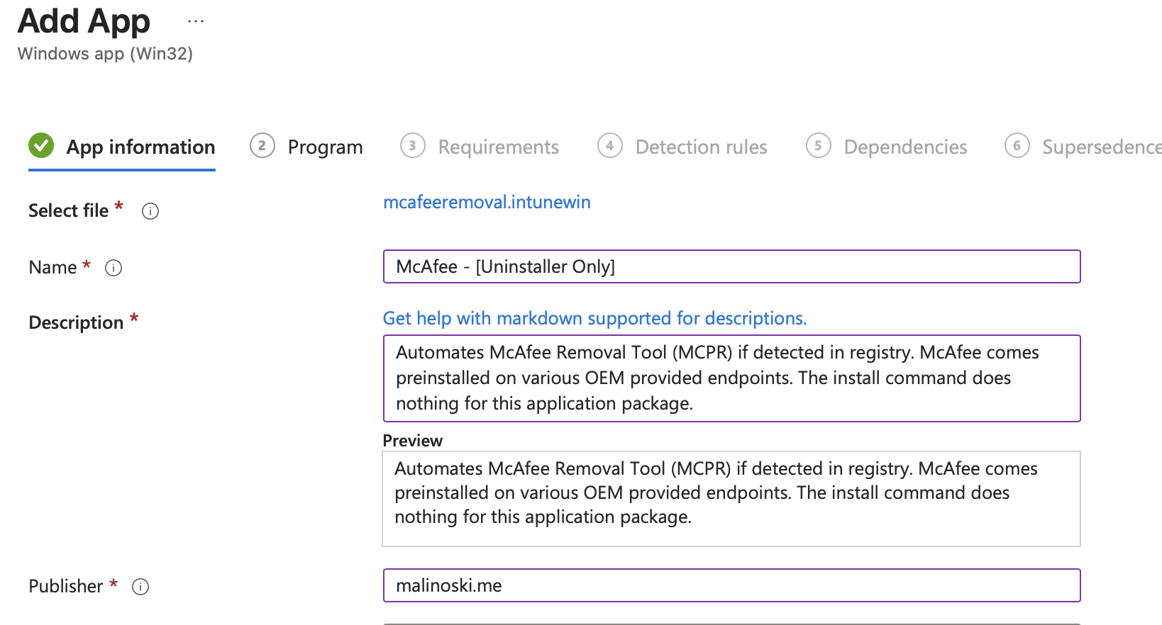 - Upload the ‘mcafeeremoval.intunewin’ Win32 File