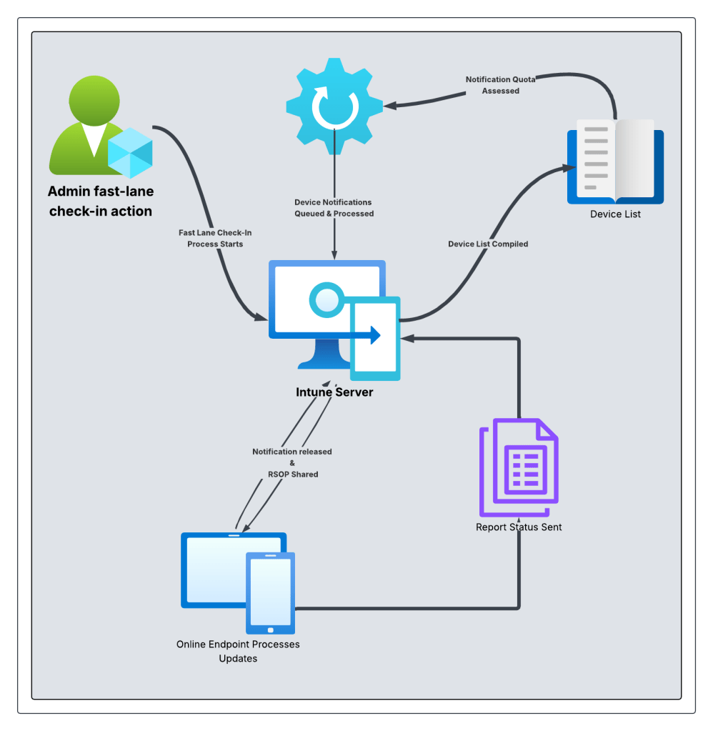 Fast Lane, or change-based updates, occur automatically when there is a detected change in the system configuration for Intune. Below are some examples of what actions will trigger this check-In: