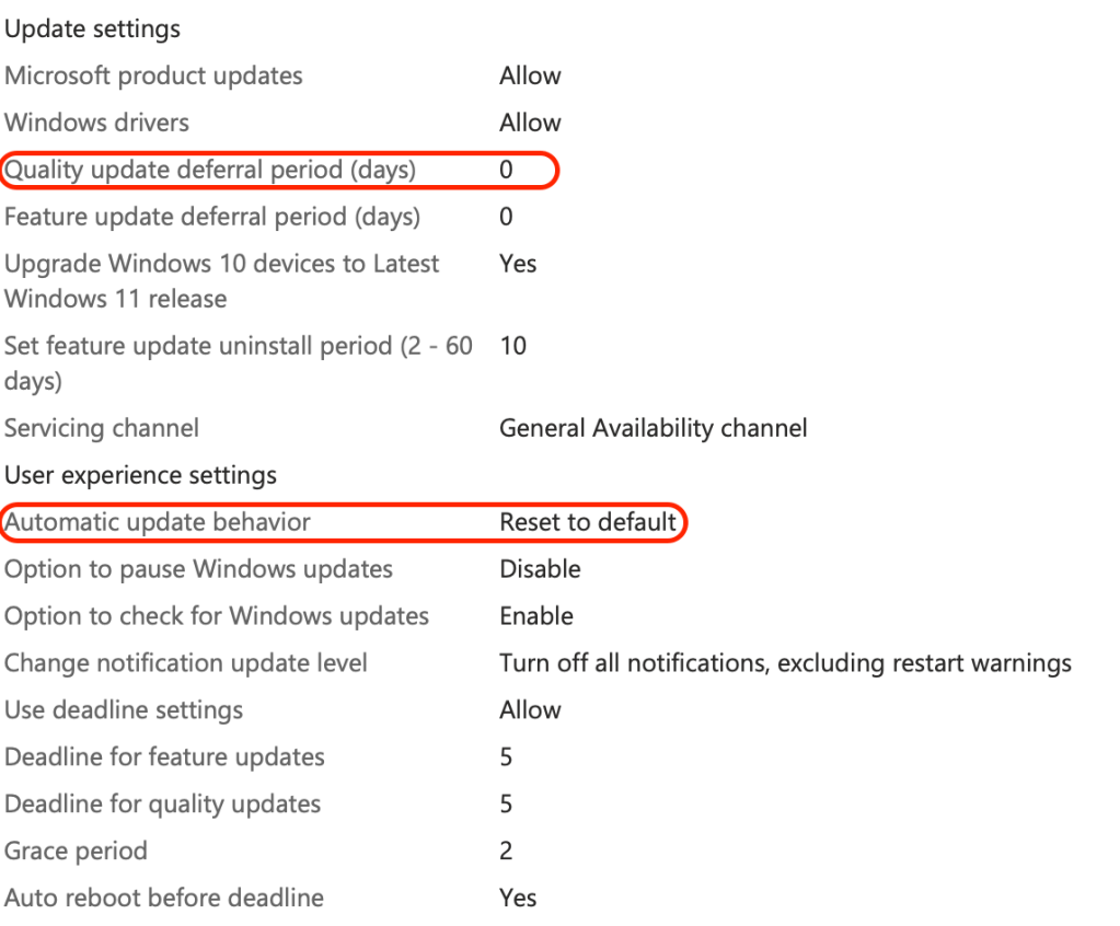 Here’s my go-to policy that I find to be a great starting place for building your client Update Ring Policy – it is worth noting that Feature update deferral period (days) is required to be set to a value of 0.
