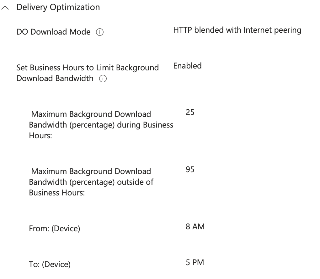 For a minimum configuration, create a new Settings Catalog profile enable background downloads and set business hours similar to below – this will also allow your devices to share and seed the update over the LAN to improve our bandwidth efficiency.
