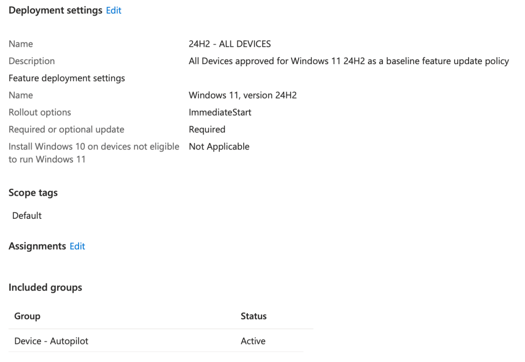 Establish a preferred feature update baseline ASAP. For most environments, I recommend starting with 24H2โit’s stable, (mostly) bug-free, and widely adopted. This is what gives you the control over when devices see new feature releases – and unlike Update Ring policies, devices can have multiple Feature Update policies assigned.