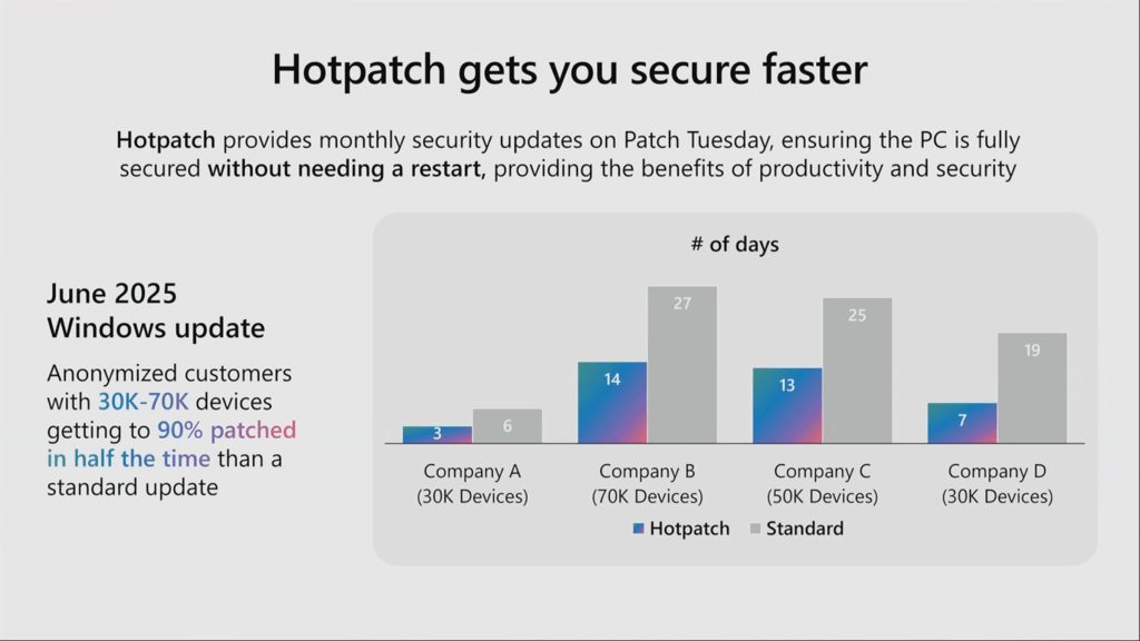 Microsoft dropped stats showing hotpatching literally cuts patching timelines in half compared to traditional update rings. No more “please reboot tonight” guilt trips. In the era of Agentic AI where endpoints are doing real work 24/7, this is non-negotiable. If you’re still sleeping on hotpatch, wake up.