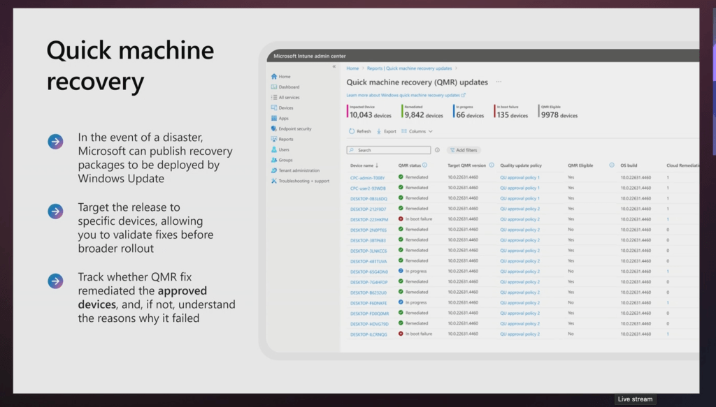 - Quick machine recovery (aka Cloud-managed restore points) for the entire Intune fleet. Yes, you heard that right. Bad patch? Roll the whole device back from the cloud, even fix boot-time issues. (CrowdStrike summer flashbacks, anyone? Microsoft just handed us the ultimate “oh no” button fix.)